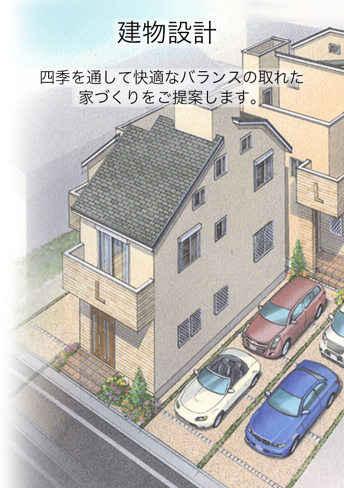建築物の設計やその工事の監理を、建築基準法に基づき行います。いろいろな建物を計画して設計図を描き建築確認の許可を受けます。その設計図に基づき現場で工事の監理を行います。ご予算と法律に合わせた建物のプランを、お客様と打合せさせていただきながら一緒に考えていきます。当事務所は落ち着く空間である木造の住宅を得意としており、犬と一緒に暮らしやすい住宅もアピールポイントの一つです。